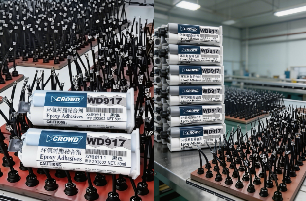 WD917环氧胶粘剂是一种黑色的常温快速固化环氧胶粘剂,该产品为双组份1︰1(体积比),具有6--8min的操作时间和15min表面初步固化的特点,适用于需要快速定位粘接的场合,对各类金属、塑料、玻璃钢、瓷器、木材等具有很强的粘接强度且韧性好,该产品粘度适中、使用操作方便,可用于流水生产线,能够大幅度提高生产效率。