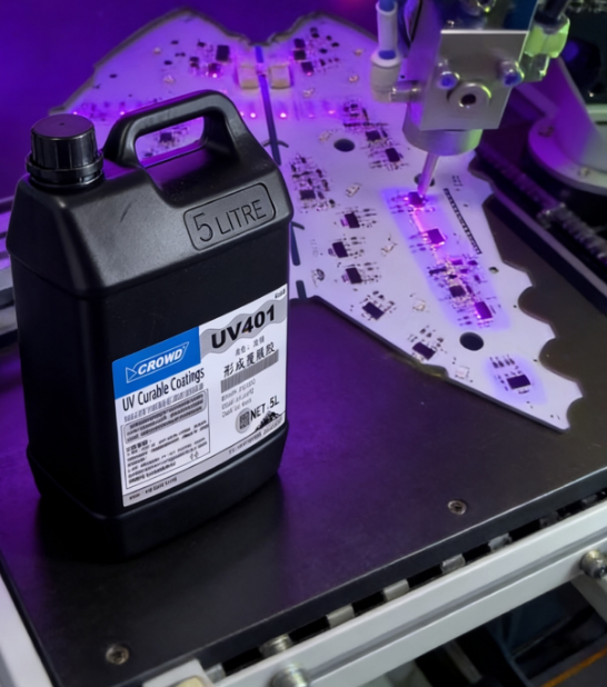 UV401是一种单组份改性丙烯酸聚氨酯酯UV涂覆胶,单组份100%固含量,具有紫外光固化和湿气固化双重固化,UV光照不到的地方可以湿气固化,应用于厚膜电路系统、多孔基材及印刷线路板的涂层保护。是一种特殊配方的涂料,用于保护线路板及其相关设备免受环境的侵蚀,具有宽广的耐温范围-45~130℃。针对复杂电子线路板中紫外光照射不到的阴影区,通过发生湿气固化,实现全面覆盖,并为各种电子电路系统提供良好的保护作用。具有防水、防潮、防尘“三防”性能和耐冷热冲击、耐老化、耐辐射、耐盐雾、耐臭氧腐蚀、耐振动、柔韧性好、附着力强等性能。符合欧盟环保要求.。